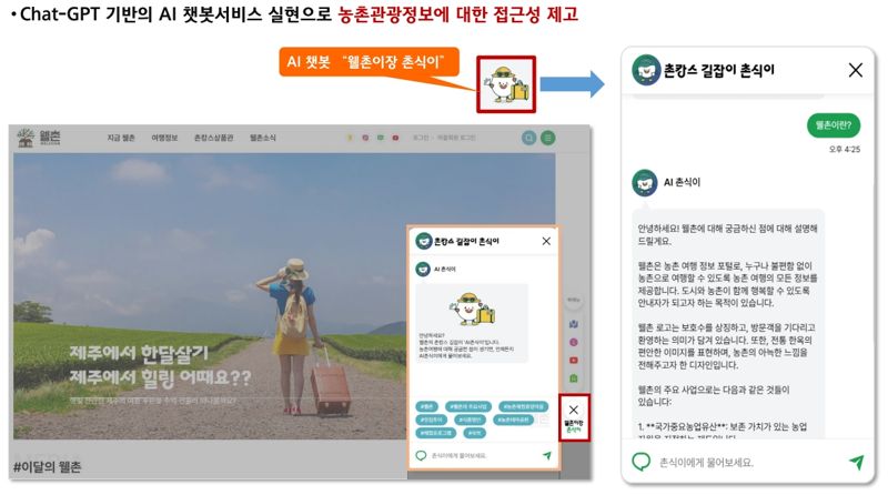 인공지능 기반 챗봇 ‘웰촌 이장 촌식이’가 도입돼 농촌여행 정보에 더해 개인별 맞춤 농촌여행 코스를 추천한다. 챗GPT 기반의 거대언어모델을 활용해 웰촌에 등록된 관광데이터를 학습하고 검색증강생성(RAG) 기술을 통해 답변 정확성도 높였다.