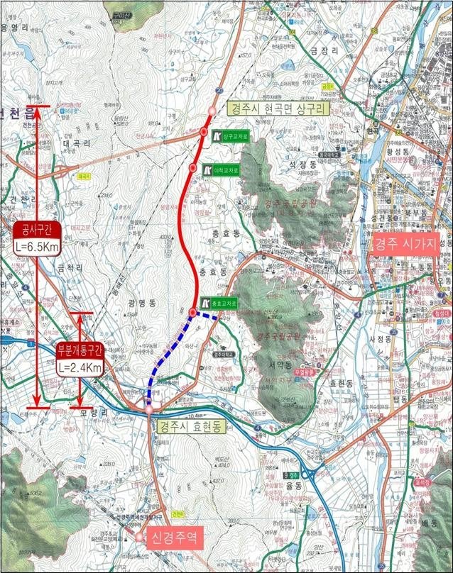 이번 개통으로 경주 도심에서 신경주역까지 접근성이 향상돼 이 구간 이용자들은 기존 국도 4호선 대체도로 통행에 비해 이동 거리 약 6.5km, 이동시간 약 5분을 단축할 수 있을 것으로 예상된다.