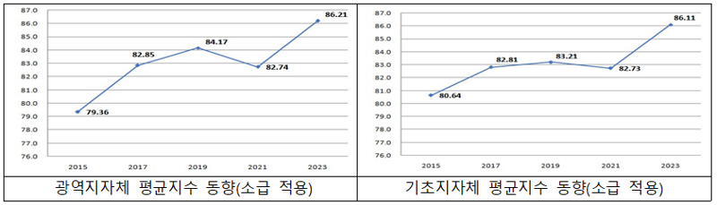 지수 분석 결과, 평균은 광역지자체가 86.21점으로 2021년(82.74점) 대비 3.47점 상승했고, 기초지자체는 86.11점으로 2021년(82.73점) 대비 3.38점이 상승해 코로나19 이후 국내 관광시장이 회복되고 있는 것으로 확인됐다.