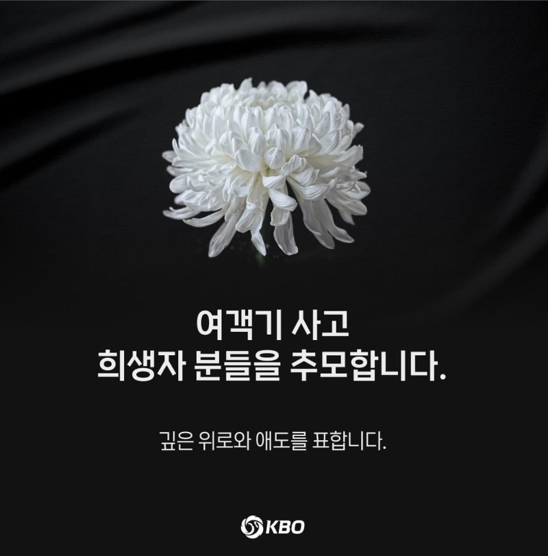 KBO는 "여객기 사고 희생자분들을 깊이 추모하며, 고귀한 생명을 잃은 비통함에 깊은 애도의 뜻을 표합니다"면서 "유가족 여러분께 진심 어린 위로와 애도의 말씀을 전합니다"라고 했다.