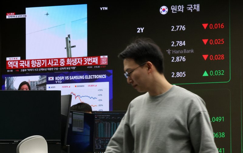 (서울=뉴스1) 김도엽 문혜원 기자 = 달러·원 환율이 강달러 압력 지속에 윤석열 대통령의 비상계엄 사태 이후 국내 정치권 불확실성이 가중되면서 1년 새 200원 가까이 뛰어올랐다. 연말 종가 기준 국제통화기금(IMF) 외환위기 이후 최고치 기록이다.