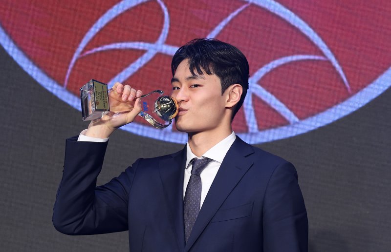 지난해 LG에 입단한 유기상은 곧바로 신인상을 받았다. 2023-24시즌 54경기 중 52경기에 나서 평균 23분34초 8.06득점 도움 0.54개 리바운드 2.21개 3점 슛 성공률 42.41%로 평생 한 번만 받을 수 있는 상을 탔다.