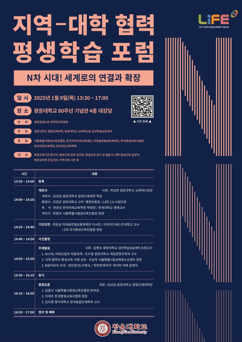 (서울=뉴스1) 권형진 기자 = 광운대 참빛인재대학은 2025년 새해를 맞아 '지역-대학 협력 평생학습 포럼'을 9일 광운대 80주년 기념관에서 개최한다고 2일 밝혔다. 'N차 시대! 세계로의 연결과 확장'을 주제로 지역사회와 대학 간의 협력을 통해 평생학습의 새로운 가능성을 모색한다.