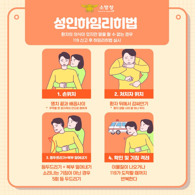 하임리히법이란 이물질로 인해 기도가 폐쇄돼 질식 위험이 있을 때 응급처치법이다.