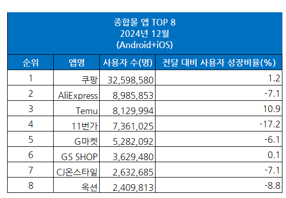 [파이낸셜뉴스] 지난해 12월 종합몰앱 이용자들이 감소세로 돌아선 가운데 쿠팡과 테무 이용자만 증가했다. 대규모 쇼핑 행사를 벌인 11월이 끝난 후 이용자 수가 감소한 것으로 보인다. 특히 테무 이용자 수는 국내에서 11번가를 제치고 세 번째로 많았다.