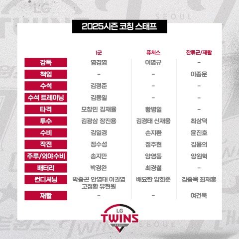 (서울=뉴스1) 이재상 기자 = 프로야구 LG 트윈스가 2025시즌 코치진의 보직을 3일 확정, 발표했다.
