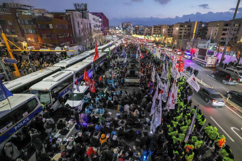 (서울=뉴스1) 정윤미 남해인 김민재 기자 = 12·3 비상계엄 사태 우두머리로 꼽히는 윤석열 대통령의 첫 번째 체포영장 집행이 무산되면서 대통령 관저가 위치한 서울 용산구 한남동에서는 눈 내리는 늦은 밤까지 진보·보수단체가 약 430m 거리를 두고 맞불 집회를 벌였다.