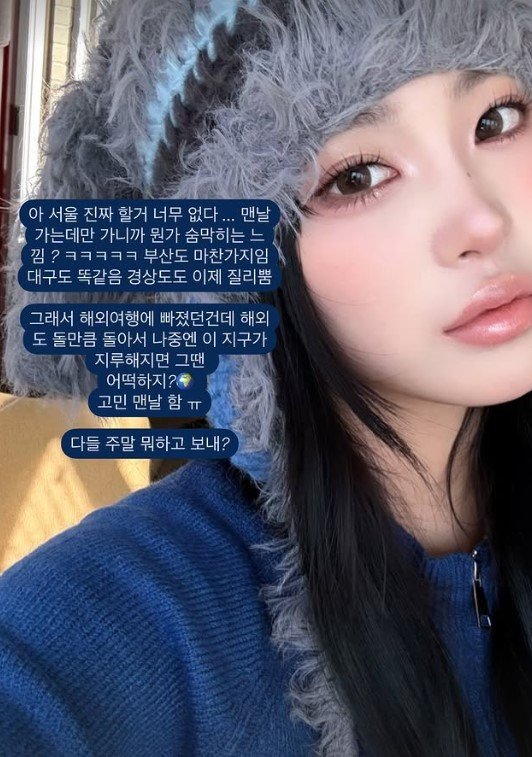 최준희는 4일 소셜미디어를 통해 "아 서울 진짜 할 거 너무 없다"고 밝혔다.