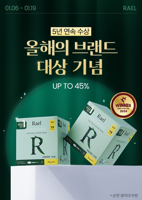 [서울=뉴시스]이승주 기자 = 우먼 웰니스 케어 브랜드 라엘이 '올해의 브랜드 대상' 순면생리대 부문 5년 연속 1위 수상을 기념해 대규모 할인 행사를 실시한다고 6일 밝혔다.