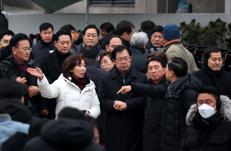 이날 오전 6시쯤 한남동 관저 인근에 국민의힘 친윤계 인사로 분류되는 의원 40여 명이 두꺼운 외투와 목도리 등을 걸치고 모였다. 강대식·강명구·강민국·강선영·강승규·권영진·구자근·김기현·김민전·김석기·김선교·김승수·김장겸·김정재·김위상·나경원·박대출·박성민·박성훈·박준태·박충권·송언석·서일준·서천호·엄태영·유상범·윤상현·이만희·이상휘·이인선·이종욱·이철규·임이자·임종득·장동혁·정동만·정점식·조배숙·조지연·최수진·최은석 의원 등이다.