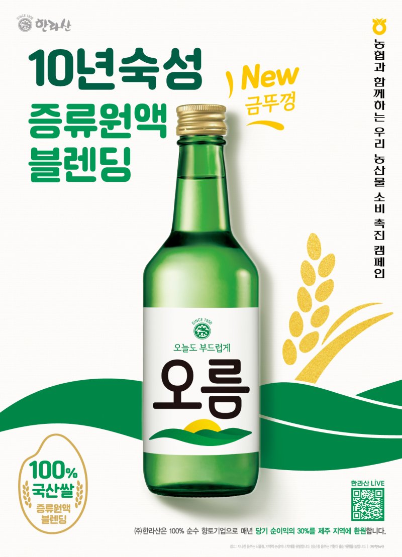 '오늘도 부드럽게 오름'은 10년 숙성된 국산 쌀 증류원액을 한라산의 자체 기술력으로 블렌딩해 탄생했다. 도수는 16도.