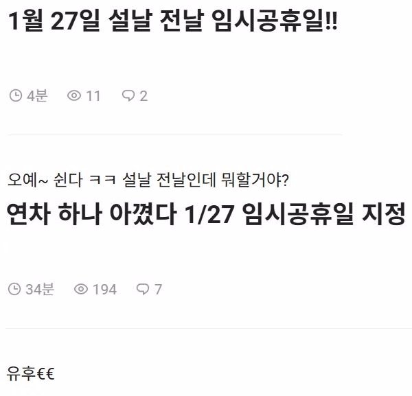 8일 다른 이용자 B씨는 정부가 임시공휴일 지정을 확정했다는 기사를 첨부하며 "연차 하나 아꼈다. 유후"라고 글을 적었다. 이 글에 누리꾼들은 "굿" "만세" 등의 댓글을 달았다.