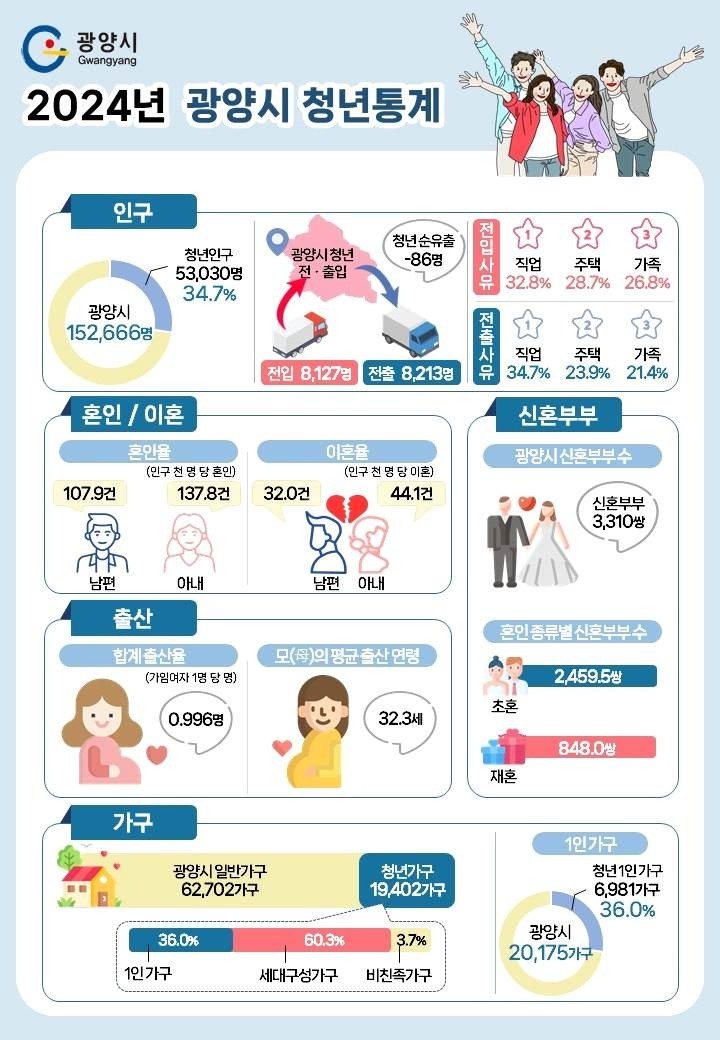 8일 광양시에 따르면 2023년 12월 말 기준으로 작성한 '광양시 청년통계' 결과를 공표했다.