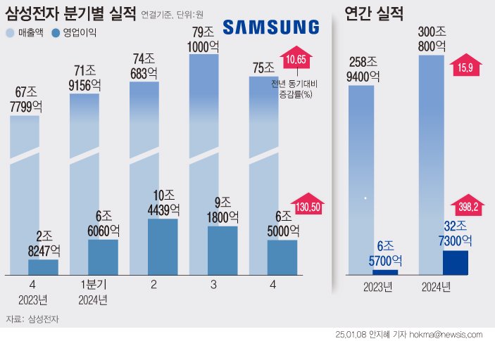 삼성전자는 8일 연결 기준 매출 75조원, 영업이익 6조5000억원의 지난해 4분기 잠정 실적을 발표했다.