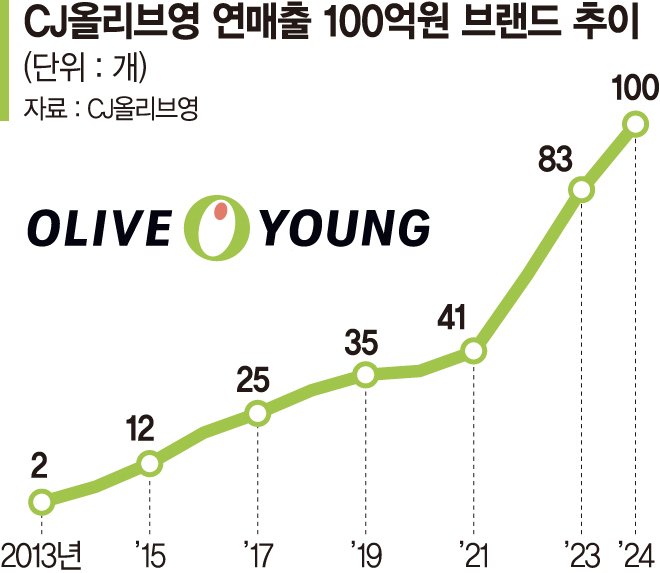CJ올리브영의 입점 브랜드 중 연간 100억원 이상 매출을 기록한 브랜드 수가 처음으로 100개를 돌파했다.