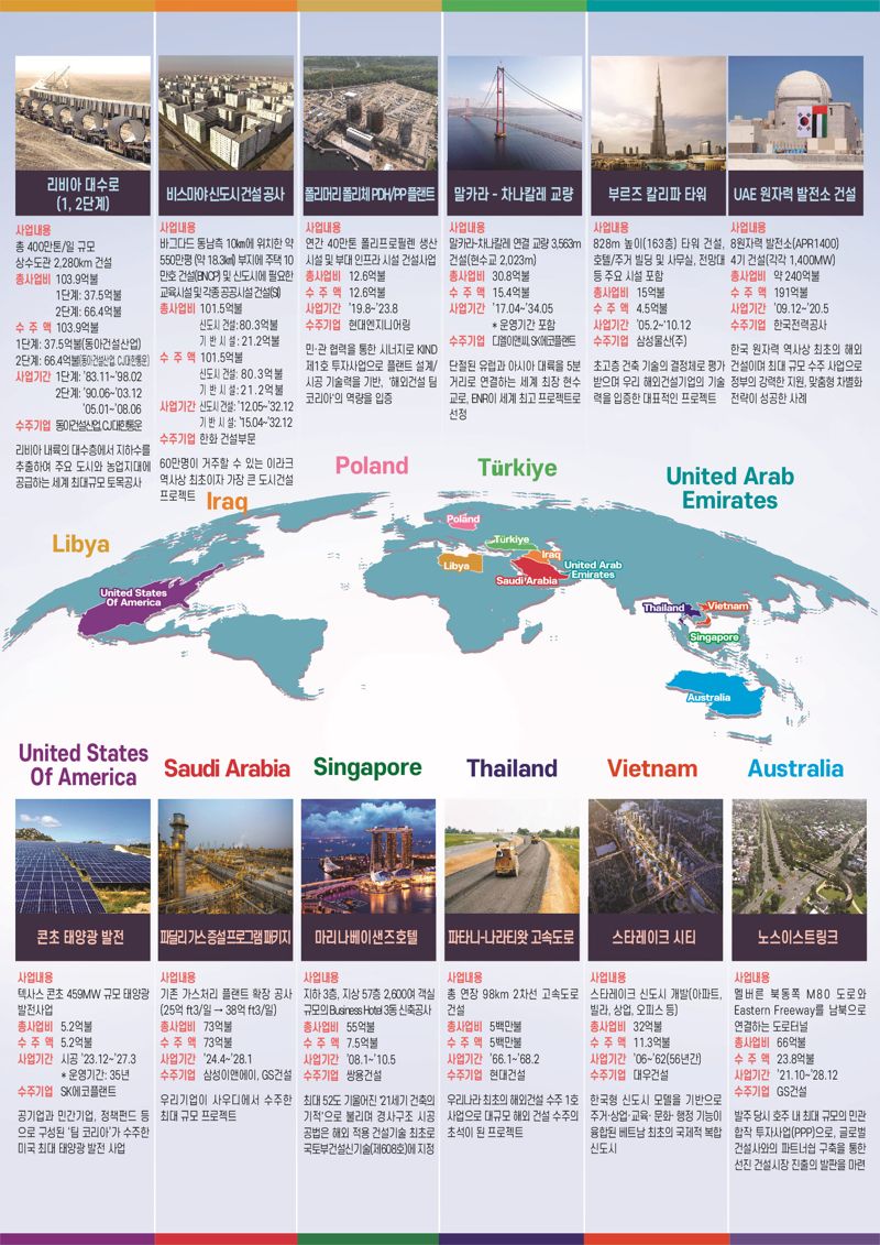 또 기존 단순 도급사업을 중심(90% 중반)으로 수주해온 데서 최근에는 투자개발에도 나서고 있다. 정부 정책지원에 힘입어 2024년에는 투자개발사업이 전년 실적의 3.5배 수준인 51억7000만달러(전체의 13.9%)로 역대 최대 실적을 거뒀다.