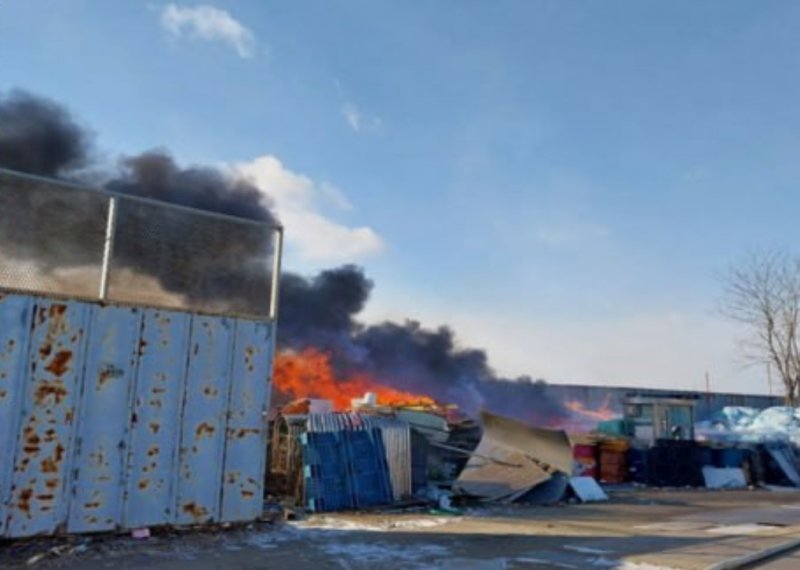 (평택=뉴스1) 김기현 기자 = 9일 오전 10시 44분 경기 평택시 팽성읍 평궁리 고물상에서 불이 나 50여 분 만에 완전히 꺼졌다.