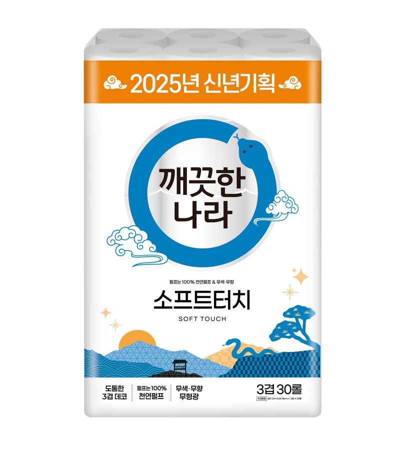깨끗한나라가 2025년 푸른 뱀의 해를 맞아 신년 패키지를 적용한 '깨끗한나라 소프트터치' 리뉴얼 제품을 출시했다.