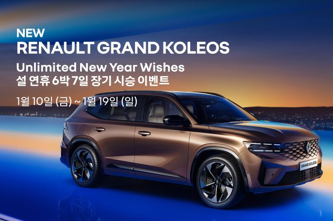 이번 설 연휴 기간 동안 그랑 콜레오스를 장기간 경험해 볼 수 있는 장기 시승 이벤트도 진행한다. 그랑 콜레오스의 장기 시승을 희망하는 고객은 오는 19일까지 르노코리아 홈페이지 또는 전국 전시장 방문을 통해 신청 가능하다. 선정된 고객은 24~30일 6박7일 동안 그랑 콜레오스를 직접 경험할 수 있다. 당첨 결과는 오는 20일 개별 통보한다.