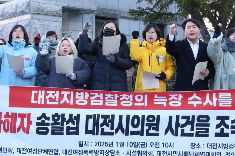 대전여성단체연합 등은 "검찰은 '소환 예정'이라는 언급만 반복하는 무책임한 태도를 멈추고 피해자 보호를 최우선으로 신속한 조사를 즉각 착수해야 한다"고 규탄했다.