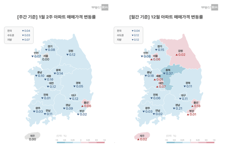 전국 17개 시도 중 하락이 14곳에 달했고 보합은 2곳, 상승은 울산(0.06%) 1곳에 머물렀다.