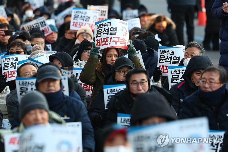 '尹체포' 긴장 고조된 한남 관저…맹추위에도 찬반집회한국노총 "체포 시까지 천막농성"…전광훈 "공수처 체포 권리 없어"