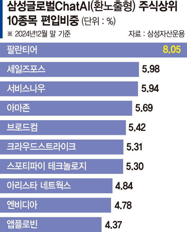삼성자산운용의 '삼성 글로벌ChatAI 펀드'는 최근 엔비디아 발 열풍으로 붐을 이룬 인공지능(AI) 열풍에 직접적인 수혜를 얻을 수 있는 주식형 펀드다. 고수익 고위험 성향의 투자자들이라면 트럼프 2기 행정부에서 부각될 인공지능 패권에 적극적으로 베팅할 만 하다는 게 회사측의 설명이다.