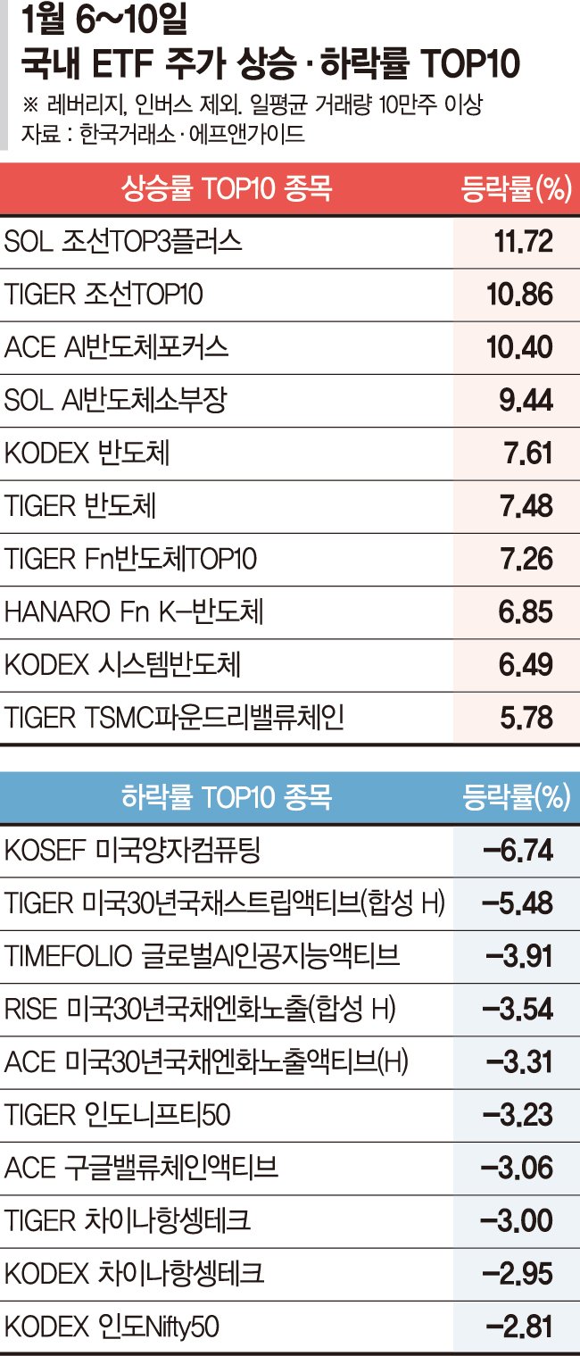 조선 및 반도체 ETF상품에 자금이 몰렸다. 트럼프 2기 행정부 수혜 전망과 증시 반등 기대감이 작용한 영향이 컸다. 반면 미국 장기 금리가 급등하면서 미 장기채 ETF의 수익률은 마이너스 행진을 이어갔다.