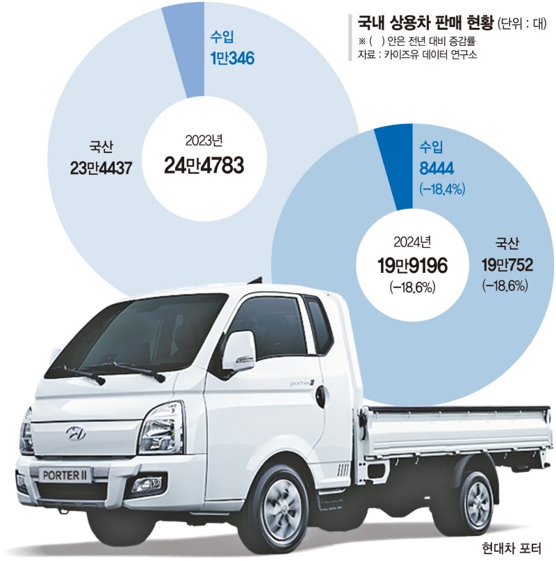 카이즈유 데이터 연구소 집계를 보면 지난해 국내 전체 상용차 판매는 19만9196대로 전년 대비 18.6% 줄었다. 국산 상용차는 전년보다 18.6%, 수입 상용차는 18.4% 감소하며 국산차와 수입차 가릴 것 없이 모두 부진했다. 자동차 업계 관계자는 "지난해 승용차 판매도 줄었지만, 소상공인과 자영업자의 어려움이 커지면서 1t 트럭 등 상용차 판매는 더욱 줄었다"고 말했다.