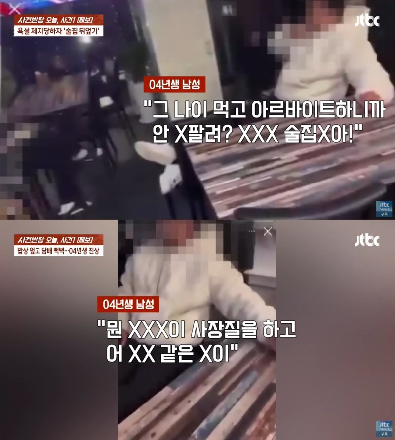 [서울=뉴시스]황소정 인턴 기자 = 한 실내 포장마차에서 조용히 해달라는 점장의 말에 불만을 품고 테이블을 뒤엎으며 소란을 피운 것도 모자라 점장에게 폭언과 욕설을 퍼부은 2004년생 남성의 모습이 포착됐다.