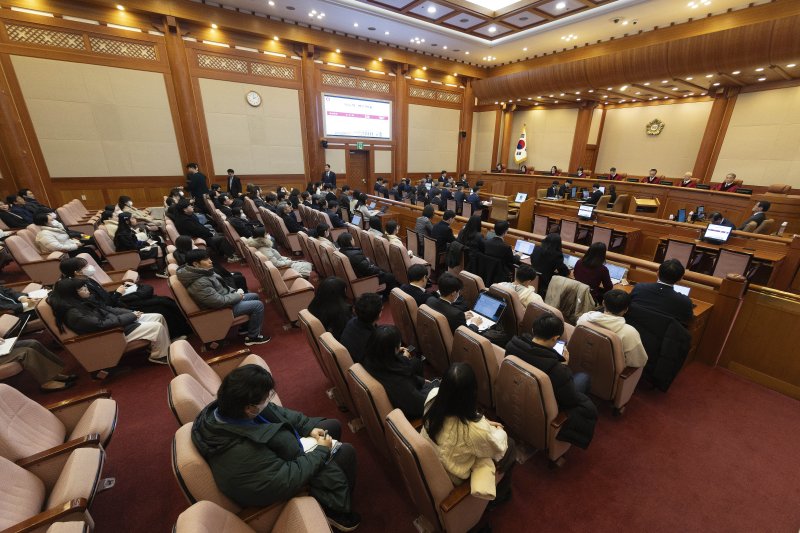 국회와 윤 대통령 측 대리인단이 대심판정 입구 옆에서 브리핑하는 사이, 방청객들은 각자 자리에 앉아 조용히 변론 개시를 기다렸다. 10~30대로 보이는 여성들, 초등학생 남아와 보호자 등 방청객들의 연령대가 크게 높지 않았다.
