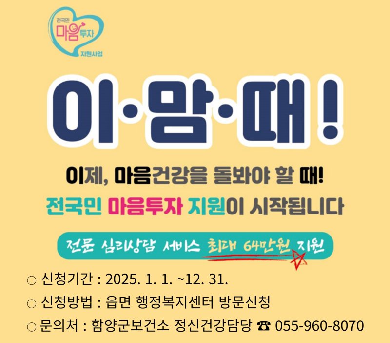 [함양=뉴시스] 서희원 기자 = 경남 함양군보건소는 정서적 어려움을 겪는 군민들의 정신건강 증진을 위해 2025년 ‘전국민 마음투자 지원사업’을 본격적으로 추진한다고 14일 밝혔다.