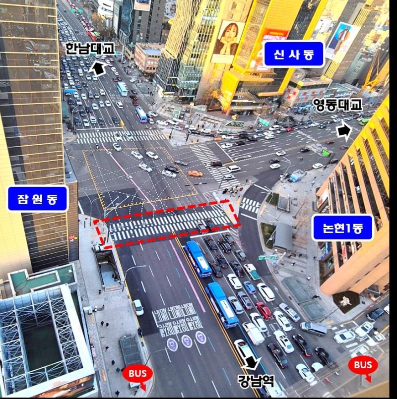 구 관계자는 "교차로에 완벽한 '□'자 횡단보도를 완성해 잠원동 주민들의 11년 숙원을 해결한 것"이라고 설명했다.