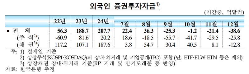 15일 한국은행이 발간한 ‘2024년 12월 이후 국제금융·외환시장 동향’에 따르면 지난달 외국인 투자자의 국내 증권투자자금은 38억6000만달러 순유출됐다. 지난 9월(-25억3000만달러) 이후 4개월 연속 순유출세다.