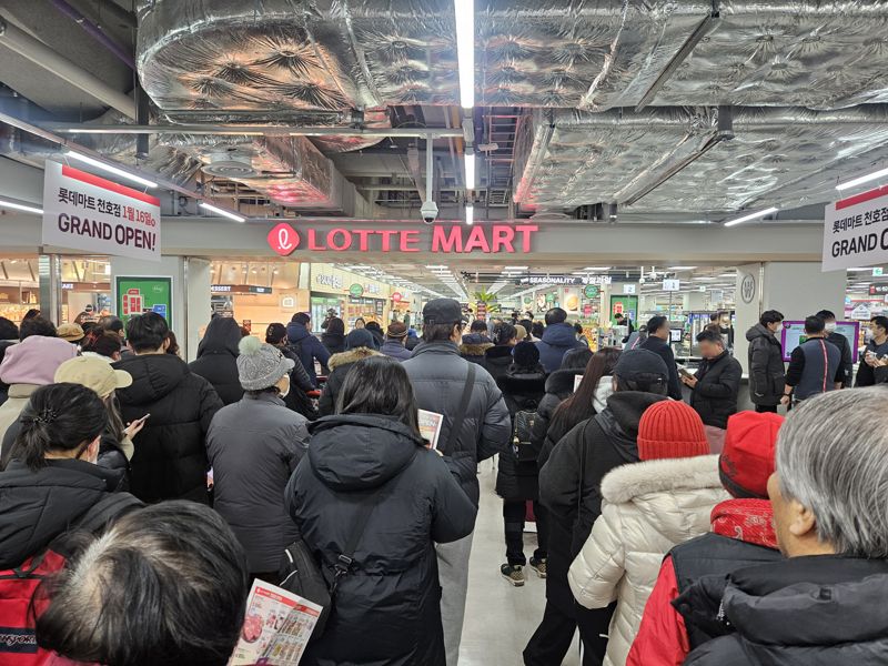 [파이낸셜뉴스] 16일 오전 10시께 서울 강동구 롯데마트 천호점 매장 앞. 행사품목이 적힌 전단지를 들여다보며 개점을 기다리는 고객들이 족히 200명은 넘어 보였다. 개점 기념으로 500g 1팩을 5990원에 판매하는 딸기를 3팩씩 담은 바구니를 들고 가는 사람부터 즉석식품을 유심히 고르는 사람들까지 매장 전체가 장 보는 사람들로 활기를 띠었다.
