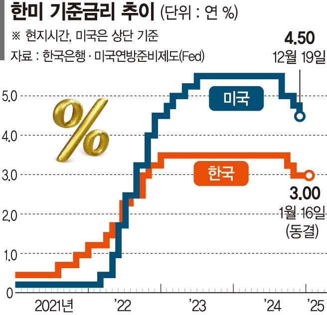 한은 금통위는 이날 기준금리를 연 3.00%로 동결했다. 환율 등 외환시장의 리스크를 우선적으로 고려한 결정이다. 직전 금통위가 열린 지난해 11월의 경우 평균 원·달러 환율은 1394.7원으로 1400원을 밑돌았다. 그러나 비상계엄 사태와 탄핵 정국을 거치면서 원·달러 환율이 지난달 1472.5원으로 한 달 사이 80원 가까이 올랐다.