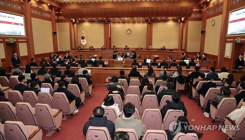 심판정 내 92개 방청석 중 70여개 좌석에 방청객이 자리했다. 더불어민주당 박범계·이성윤·최기상 의원, 조국혁신당 박은정 의원, 개혁신당 천하람 의원 등 국회 소추위원단도 방청석에서 변론을 지켜봤다.