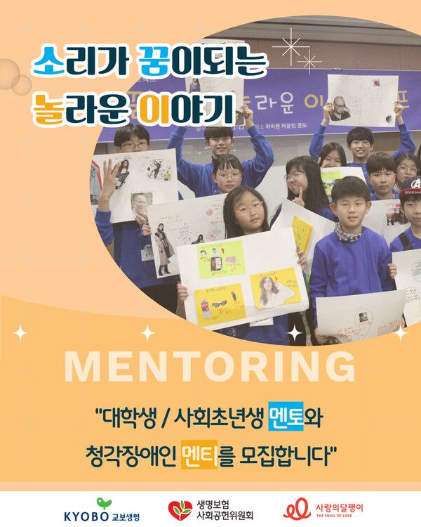 [파이낸셜뉴스] 청각장애인을 지원하는 사단법인 사랑의달팽이는 교보생명과 함께 오는 24일까지 멘토링 프로젝트 ‘소꿈놀이’의 멘티와 멘토를 모집한다고 17일 밝혔다.
