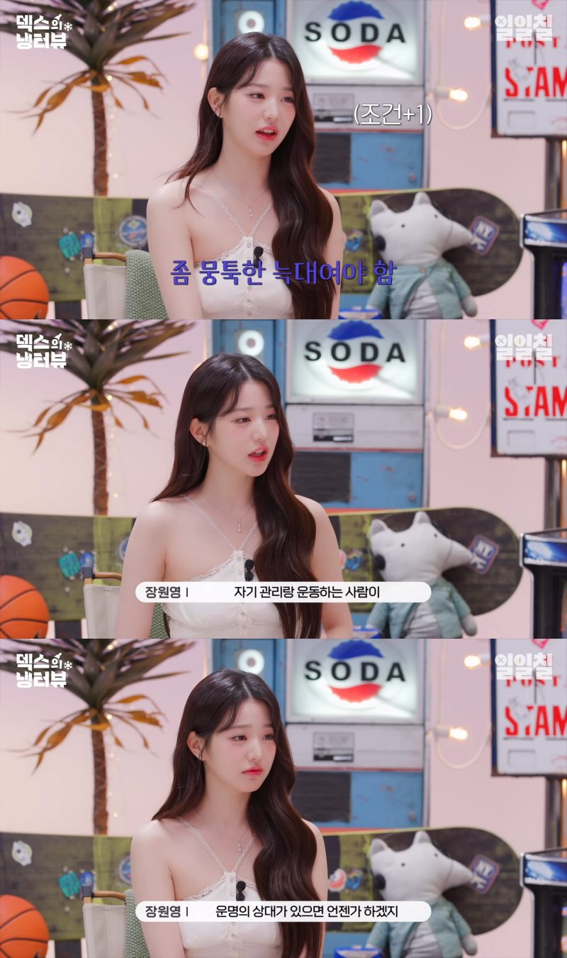 늑대상이 이상형이라는 장원영은 "자기 관리, 운동하는 사람이 좋다"며 "잘 삐지는 거. 왜 삐졌는지 말 안 하는 사람은 싫다. 무던한 사람이 좋다"고 밝혔다.