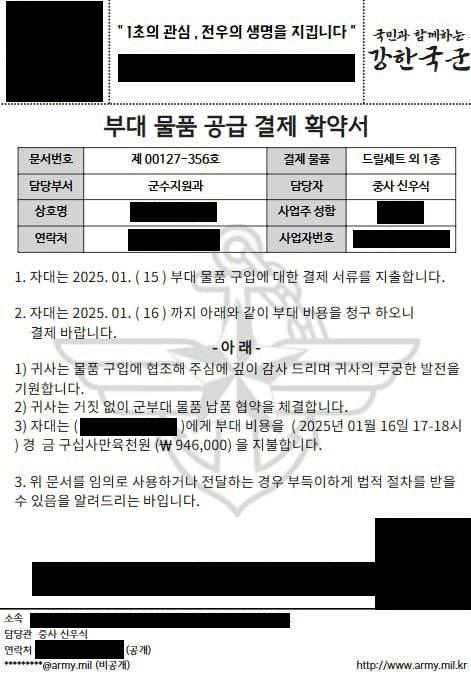 군 간부를 사칭한 신원미상자는 ‘부대 물품 공급 결제 확약서’, ‘2025년도 부대정비 소모품 구매 승인’ 명칭의 가짜 공문을 제시했으며 공문에는 부대명, 집행액, 담당자 명칭 등 신뢰할 수 있는 정보도 담겼지만 부대에서는 실존하지 않는 담당자와 요청임을 확인됐다.