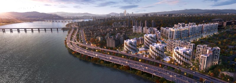 현대건설은 자하 하디드 아키텍츠와 협력해 곡선형 알루미늄 패널 8만8000장을 활용한 외관 디자인과 한강의 물결을 형상화한 더블 스카이 브릿지를 내세웠다. 스카이 커뮤니티 시설에는 한강조망 인피니트풀도 특징이다.