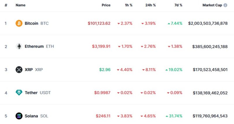 시총 1위 비트코인은 3.19%, 시총 2위 이더리움은 2.76% 각각 하락하고 있다.