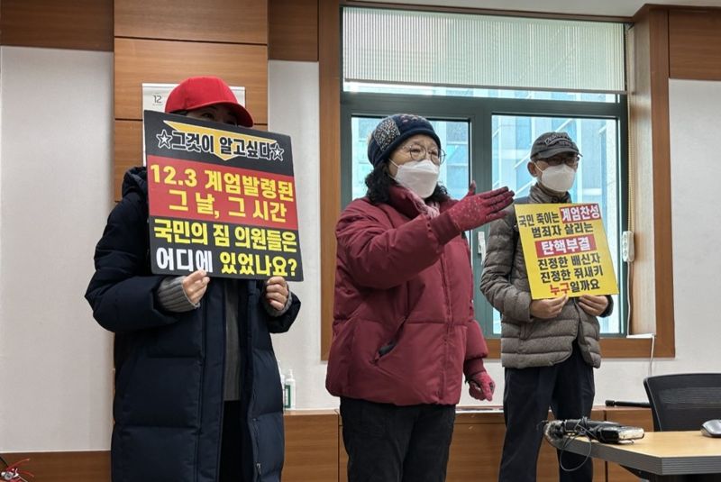 일부는 "계엄 발령된 그날, 국민의 짐 의원들은 어디에 있었나요?", "국민 죽이는 계엄 찬성, 범죄자 살리는 탄핵 부결, 진정한 배신자 누구일까요"라고 쓴 손팻말을 들고나왔다.