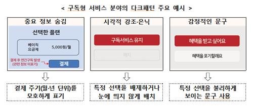 구독형 서비스 분야의 다크패턴 사례로는 결제와 같은 특정 선택을 유도하거나 해지를 제한해 이용자의 자율성을 침해하는 중요 정보 숨김, 시각적 강조·은닉, 감정적인 문구 사용 등이 제시됐다.