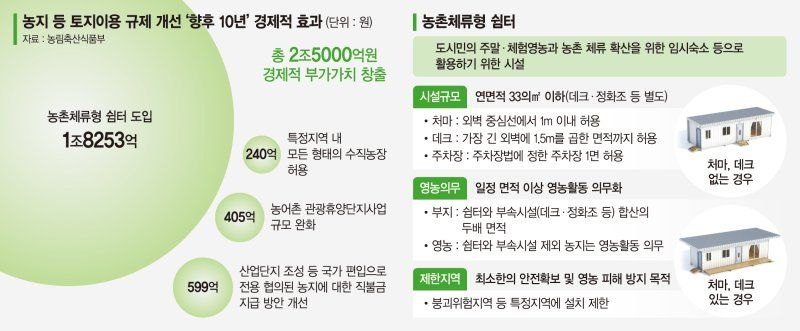 농촌 체류형 쉼터는 개인이 농지에 농지 전용 허가 등의 절차 없이, 가설건축물 축조 신고와 농지대장 등재 등의 절차만으로 데크·주차장·정화조 등 부속시설을 제외한 연면적 33㎡ 이내로 설치할 수 있다.
