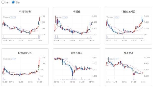 ※ [항공] 이슈 관련 종목 : 티웨이항공, 예림당, 대명소노시즌, 티웨이홀딩스, 하이즈항공