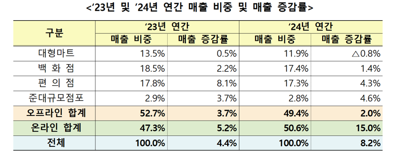 온라인은 해외 플랫폼 국내진출 강화, 티메프 사태에도 불구하고 온라인 구매가 확대되는 식품(22.1%), 서비스(58.3%, e-쿠폰, 음식배달, 공연·여행티켓 등) 분야를 중심으로 매출이 성장했다.