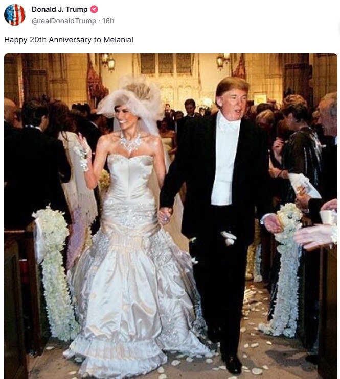 트럼프 대통령은 사회관계망서비스(SNS) 트루스소셜에 "멜라니아, 행복한 (결혼) 20주년을 축하합니다"라는 내용과 함께 20년 전 결혼식 사진을 게재했다.