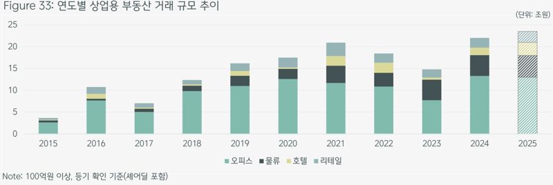 24일 글로벌 최대 종합 부동산 서비스 기업 CBRE코리아에 따르면 2024년 상업용 부동산 시장 거래 규모는 약 22조원으로 2023년 대비 약 49% 늘었다.