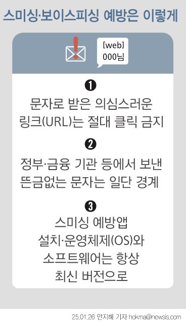 스미싱·피싱 피해 사전 예방을 위해서는 ▲출처가 불명확한 인터넷주소나 전화번호 클릭 금지 ▲공인 앱마켓을 통한 앱 다운로드 ▲백신 앱 설치 및 최신 버전 업데이트 등의 보안 수칙을 준수해야 한다.